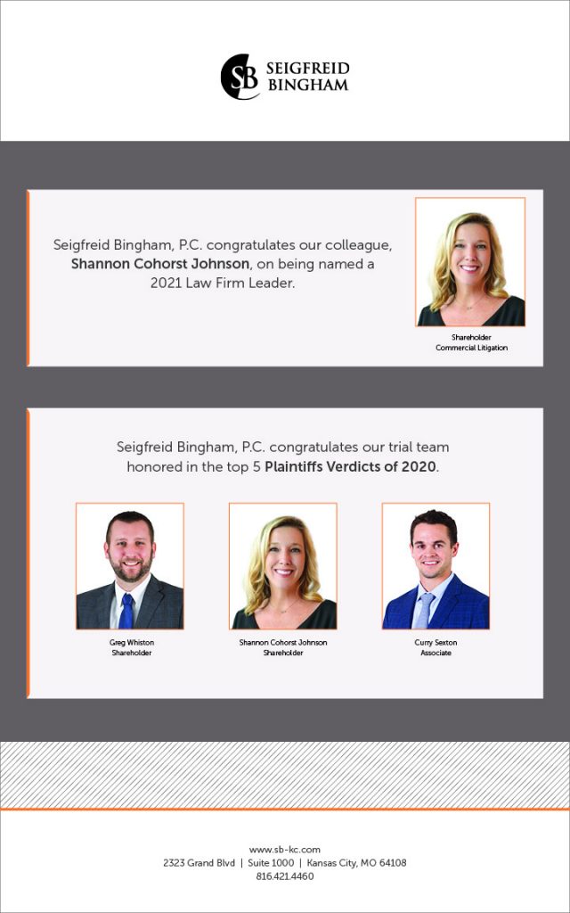 Kansas City - A Seigfreid Bingham trial team was recognized by Missouri Lawyers Media in the Top 5 Plaintiffs Verdicts of 2020.